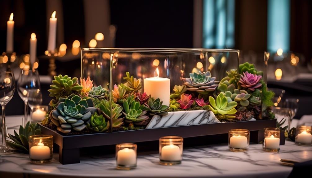 - Consider a geometric terrarium centerpiece: For a modern and clean aesthetic, think about creating a geometric terrarium centerpiece. This won't only showcase your succulents but also serve as a striking focal point for your tables.